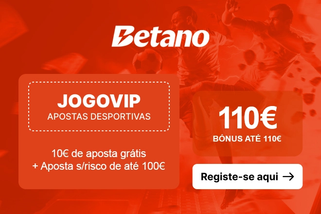 O bónus de boas-vindas da Betano oferece 10 euros em Aposta Grátis no registo. Não é necessário depósito e pode inserir o código promocional Betano JOGOVIP. Além disso, recebe ainda uma aposta sem risco de até 100€.