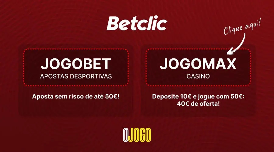 Use o código promocional Betclic JOGOVIP ao fazer o registo na Betclic. Como novo utilizador pode obter uma aposta até 50 euros. Deve fazer um depósito de pelo menos 50 euros para receber a oferta e obedecer a todos os termos.