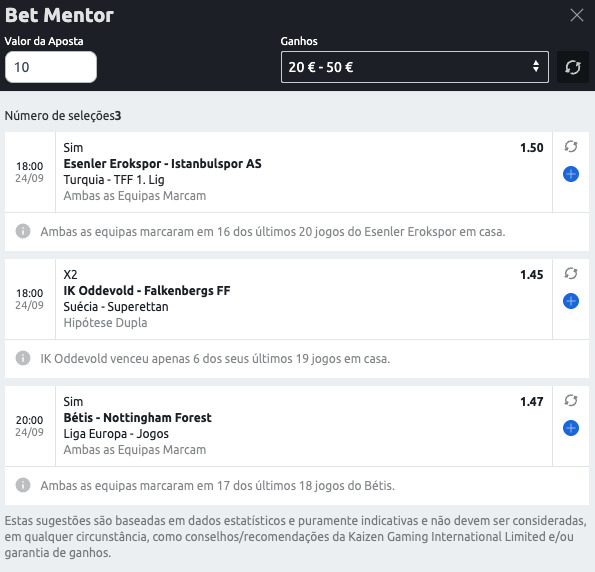 Disponível na página inicial da plataforma, o Bet Mentor é um sistema integrado que indica opções de Betano aposta aos clientes. Para obter resultados, o apostador só necessita de inserir o valor monetário que pretende apostar e o intervalo de dinheiro que procura receber com essa aposta. A partir destes dados, a operadora sugere um conjunto de Betano aposta tendo em vista esses números.