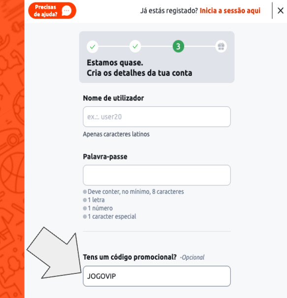 - Insira o código promocional Betano JOGOVIP ou JOGOMAX no campo de código promocional para receber o bónus de boas-vindas da Betano.