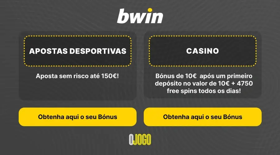Sim. A bwin oferece um bwin bonus boas vindas para apostas desportivas e outro bwin bonus registo para casino. O bwin bonus para ofertas desportivas consiste numa Aposta sem Risco até 150€. Se a aposta for perdida, recebe o valor de volta até o máximo de 150€. O bwin casino bonus para novos utilizadores permite que o utilizador deposite e jogue 10€ e a bwin oferece um bónus de 20€ para jogar.