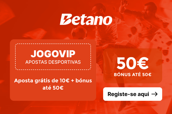 - Para Apostas Desportivas (Codigo promocional Betano JOGOVIP): Ganhe um pacote triplo de 10€ grátis no registo, 50 rodadas grátis e um bónus de depósito até 50€.