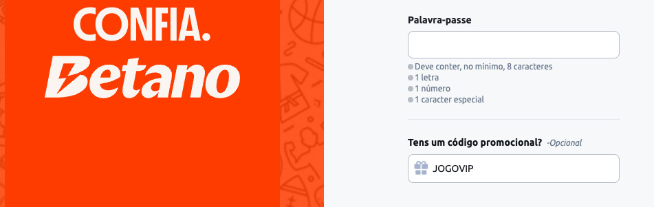 - Insira o código: No 3º passo do registo, no campo "Tem um Código Promocional?", insira JOGOVIP (para desporto) ou JOGOMAX (para casino).