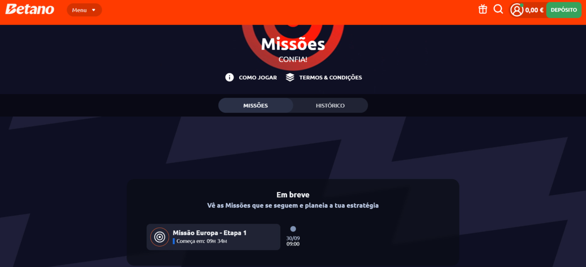 Decorrendo em eventos de maior importância, as Missões Betano funcionam de forma simples. Assim que entrar no desafio, deverá realizar as apostas necessárias para receber a oferta. Poderá optar por uma aposta simples, uma aposta múltipla ou várias apostas até atingir o valor mínimo exigido.