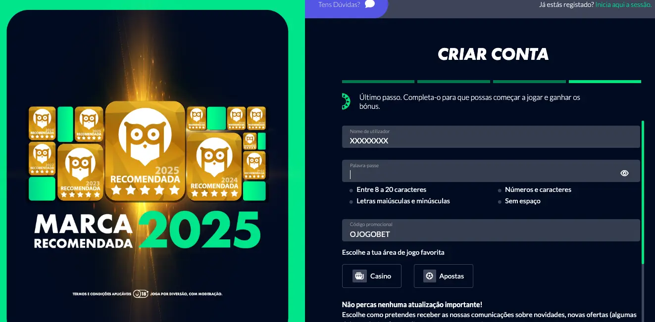 - Para Apostas Desportivas, o código é OJOGOBET e recebe 30€ em freebets e 25 spins grátis.