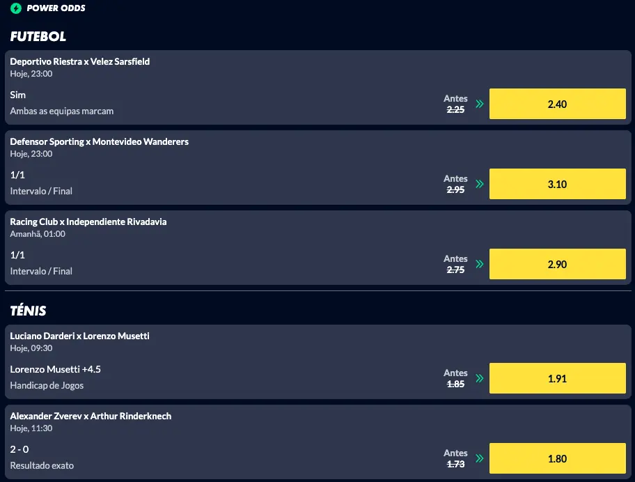 As Power Odds da Solverde.pt surgem como o catalisador para a transformar num ganho ainda mais expressivo. A Solverde melhora as odds de determinados mercados de apostas para que seja possível aumentar os seus ganhos. Estão disponíveis todos os dias e em diversas modalidades como pode perceber na imagem abaixo.