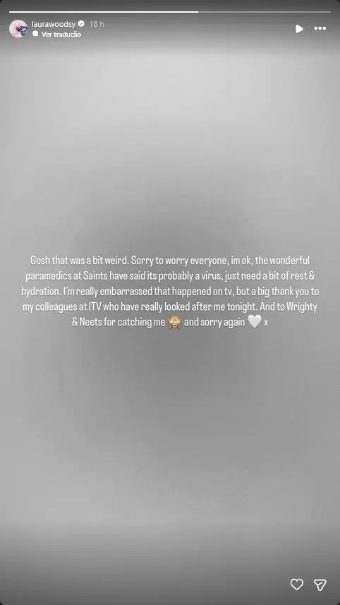 Laura Woods, jornalista inglesa da ITV, Amazon Prime e TNT Sports, desmaiou num direto da ITV antes do Inglaterra-Gana em futebol feminino. Foi agarrada pelo ex-futebolista Ian Wright, que impediu que caísse desamparada no chão. Entretanto, recorreu às redes sociais para tranquilizar os fãs, afirmando estar bem.