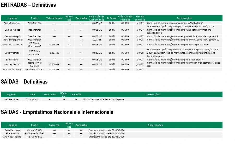 A SAD do Sporting detalhou esta sexta-feira todas as transferências que realizou durante o último mercado de verão no futebol feminino.
