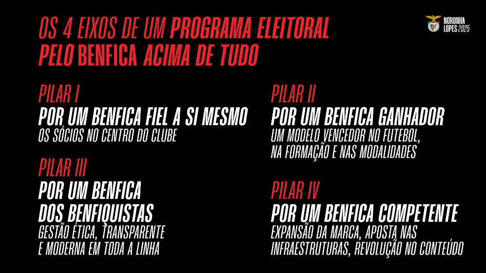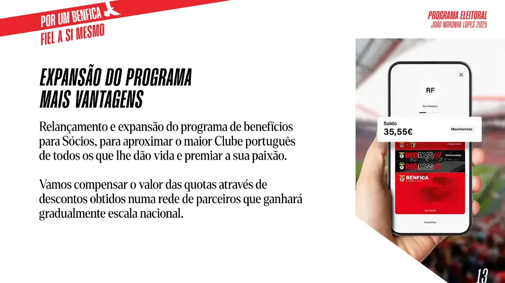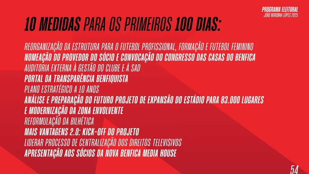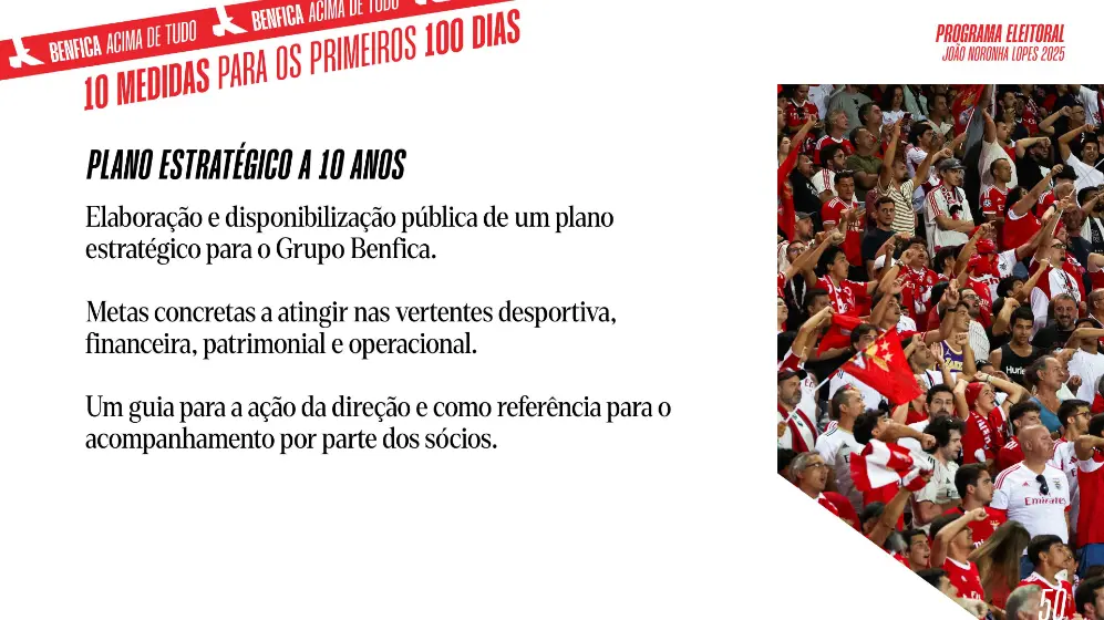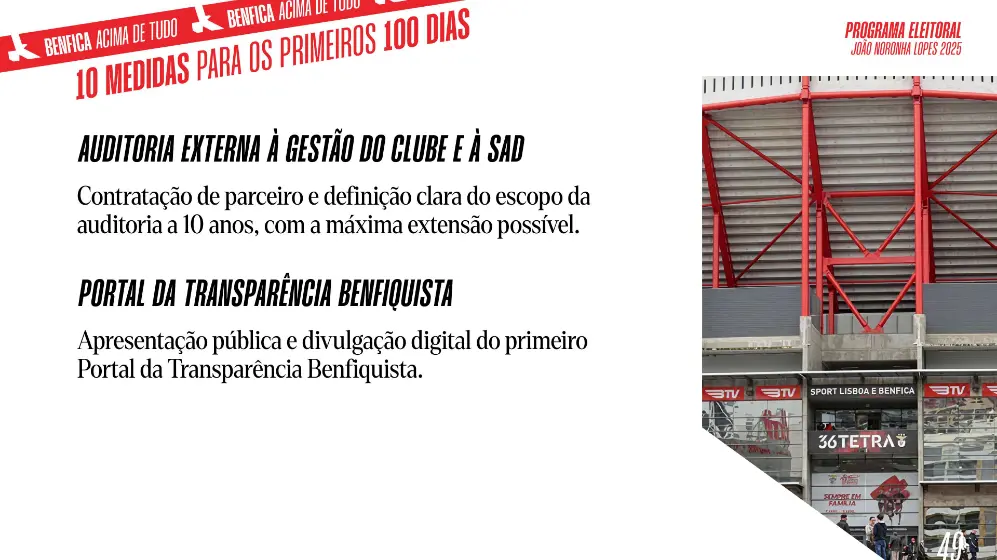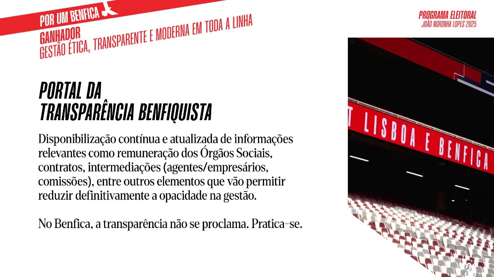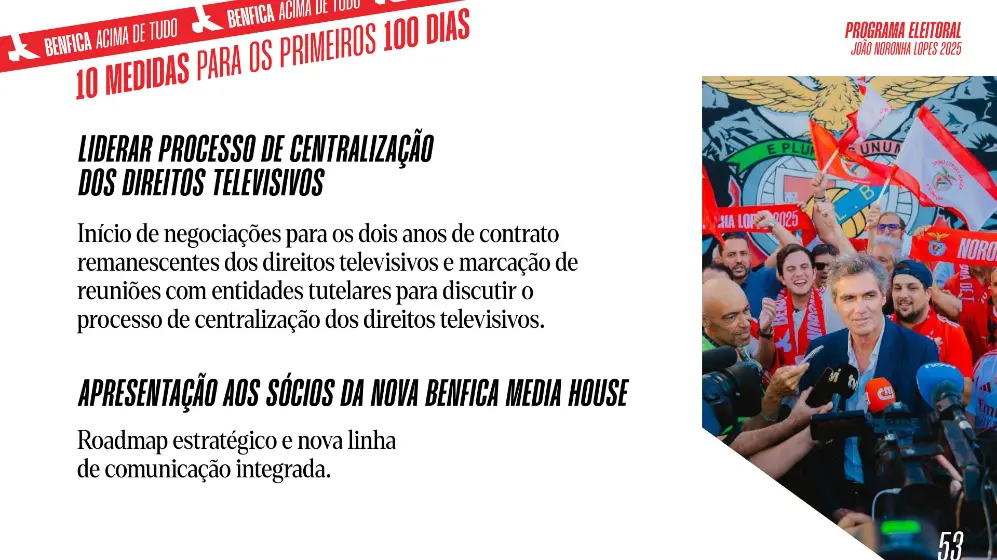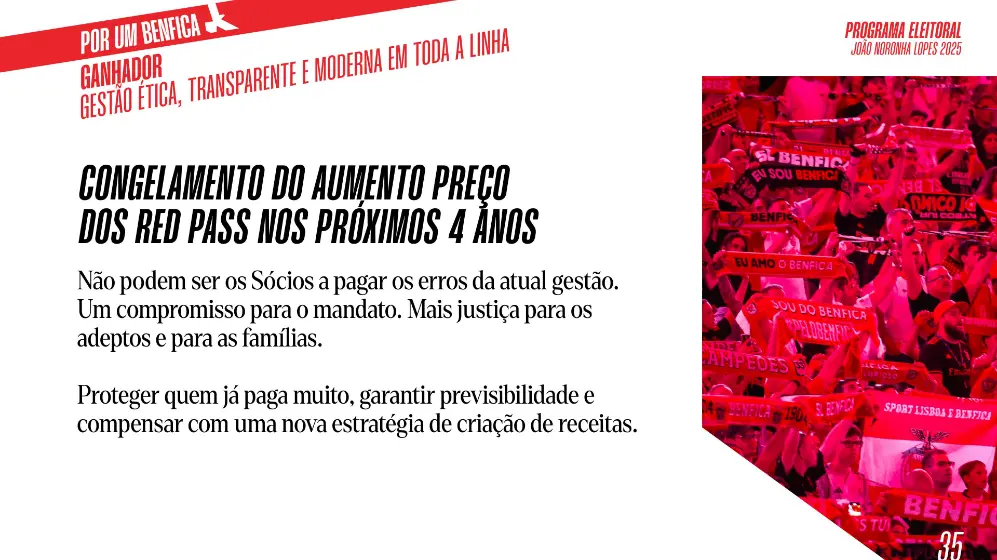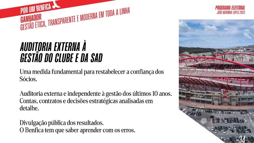 "Só ele é que me conseguia convencer. Vou ter vida muito fácil ao ouvir que querem sustentabilidade financeira. É inquestionável na gestão ter boa governança e ética. A Liderança tem de apregoar, mas tem de praticar e levar a sério. Este é o caminho que o Benfica vai seguir. Não são as direções donas do clube, são os sócios. Auditoria externa à gestão do clube Iogo de entrada. Independente, englobará toda a atividade do Benfica, não só para contratos, por número de contratos, vai fazer contas do clube, contratos e decisões estratégicas. Fazer auditoria sem divulgar aos sócios de pouco servirá. O Benfica tem de aprender com os erros e ter gestão muito mais transparente e ética. Uma das medidas emblemáticas é o congelamento do aumento do preço dos Red Pass nos próximo 4 anos. Não podem ser os sócios a pagarem os erros das direções. Um passo importantíssimo para garantir a ética é ter portal da transparência benfiquista. Pegar nas informações relevantes, não serem só divulgadas nas vésperas da AG, é dar acesso às questões mais relevantes, contratos mais relevantes, intermediações, remunerações dos órgãos sociais. O que depende de nós são os custos, os proveitos dependem do mercado. No futebol dependem se bate na barra ou se passamos aos oitavos ou quartos. É aí que vamos ter de ter atenção, garantindo investimento, mas de forma responsável. Se conseguirmos o equilibrar dos custos com os proveitos conseguimos ajudar muito a não depender da transação dos nossos talentos, podemos reter e mais tarde podem sair. Mas não terem de sair assim que têm uma época boa. Temos de liderar o processo da centralização dos direitos de televisão. O Benfica vai ser gravemente prejudicado porque uma das suas principais fontes de receita são os direitos televisivos. Quem não defende agora está a colocar o futuro do Benfica em causa. É o Benfica que garante a sustentabilidade do futebol português. Enche os estádios e garante audiência. É o Benfica que salva e é isso que tem de ser reconhecido. Não podemos ser prejudicados neste processo."