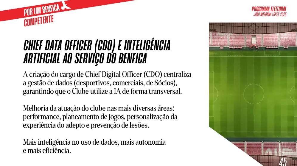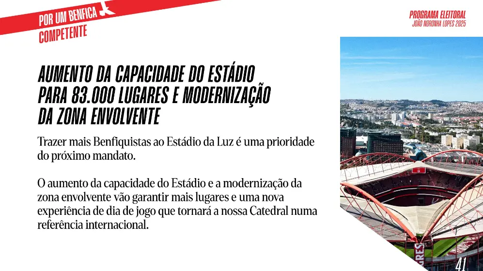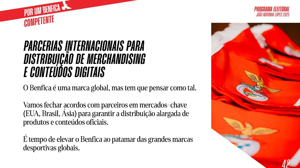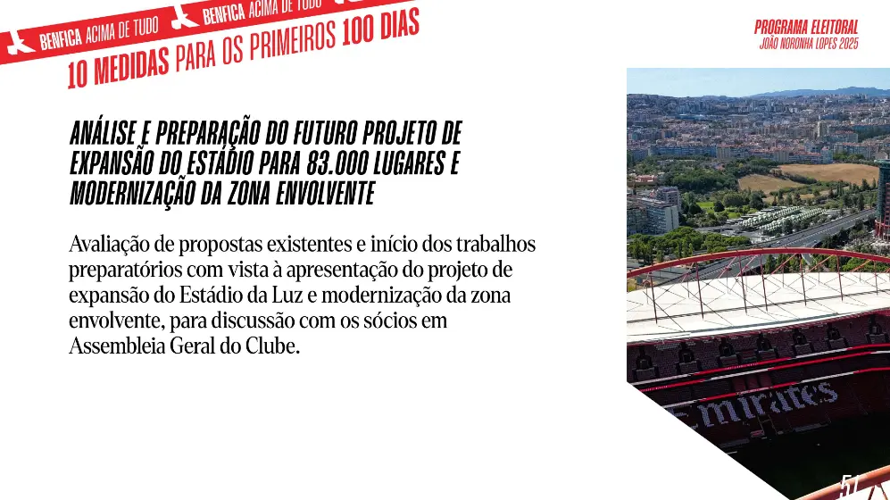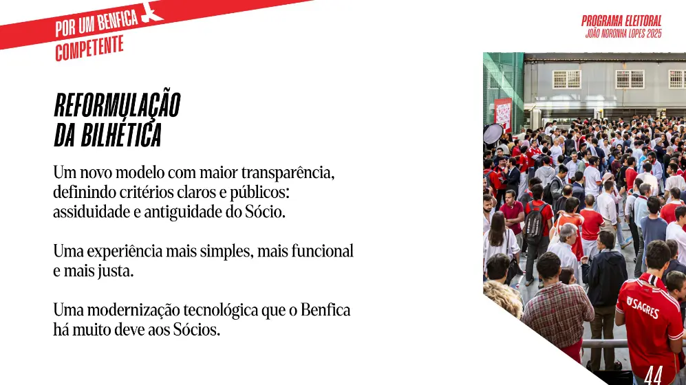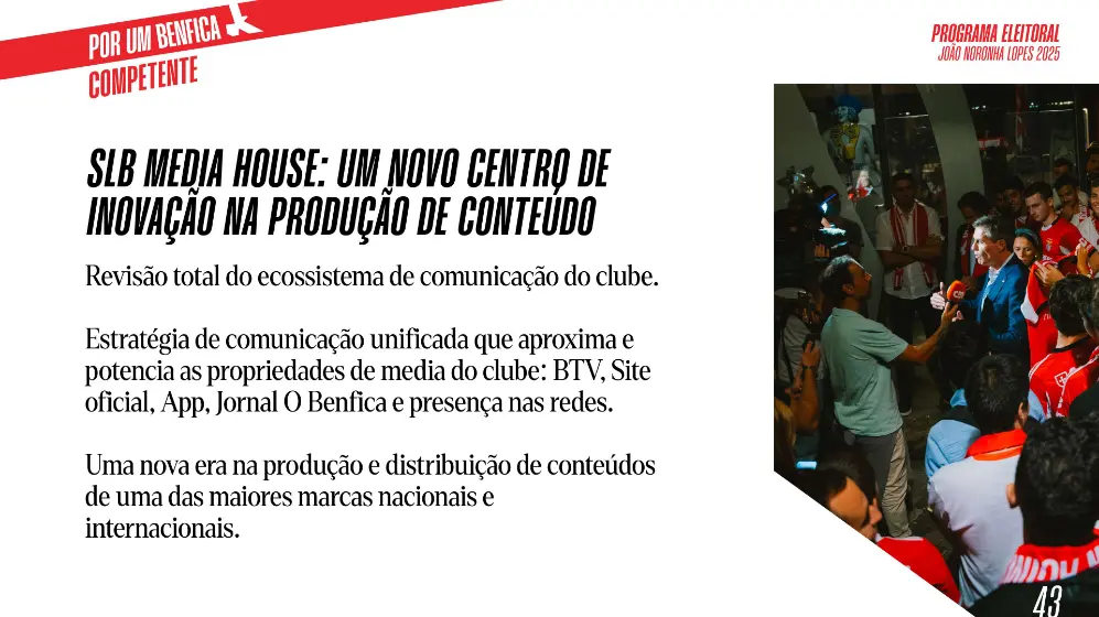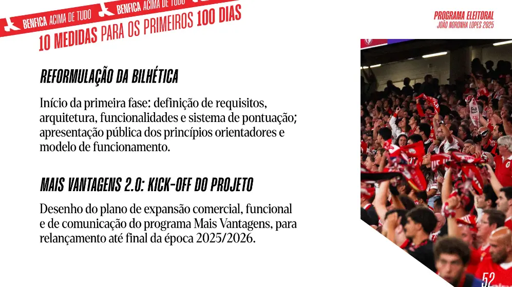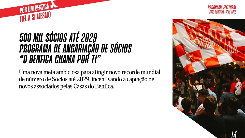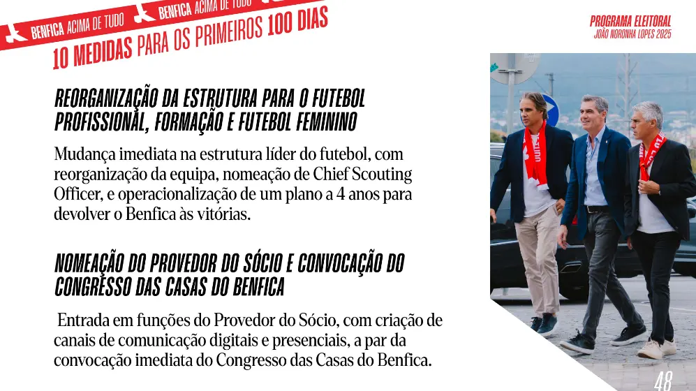 "Só ele é que me conseguia convencer. Vou ter vida muito fácil ao ouvir que querem sustentabilidade financeira. É inquestionável na gestão ter boa governança e ética. A Liderança tem de apregoar, mas tem de praticar e levar a sério. Este é o caminho que o Benfica vai seguir. Não são as direções donas do clube, são os sócios. Auditoria externa à gestão do clube Iogo de entrada. Independente, englobará toda a atividade do Benfica, não só para contratos, por número de contratos, vai fazer contas do clube, contratos e decisões estratégicas. Fazer auditoria sem divulgar aos sócios de pouco servirá. O Benfica tem de aprender com os erros e ter gestão muito mais transparente e ética. Uma das medidas emblemáticas é o congelamento do aumento do preço dos Red Pass nos próximo 4 anos. Não podem ser os sócios a pagarem os erros das direções. Um passo importantíssimo para garantir a ética é ter portal da transparência benfiquista. Pegar nas informações relevantes, não serem só divulgadas nas vésperas da AG, é dar acesso às questões mais relevantes, contratos mais relevantes, intermediações, remunerações dos órgãos sociais. O que depende de nós são os custos, os proveitos dependem do mercado. No futebol dependem se bate na barra ou se passamos aos oitavos ou quartos. É aí que vamos ter de ter atenção, garantindo investimento, mas de forma responsável. Se conseguirmos o equilibrar dos custos com os proveitos conseguimos ajudar muito a não depender da transação dos nossos talentos, podemos reter e mais tarde podem sair. Mas não terem de sair assim que têm uma época boa. Temos de liderar o processo da centralização dos direitos de televisão. O Benfica vai ser gravemente prejudicado porque uma das suas principais fontes de receita são os direitos televisivos. Quem não defende agora está a colocar o futuro do Benfica em causa. É o Benfica que garante a sustentabilidade do futebol português. Enche os estádios e garante audiência. É o Benfica que salva e é isso que tem de ser reconhecido. Não podemos ser prejudicados neste processo."
