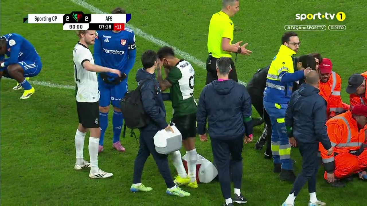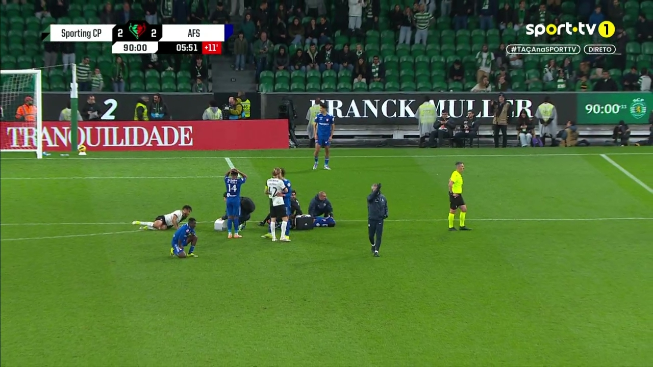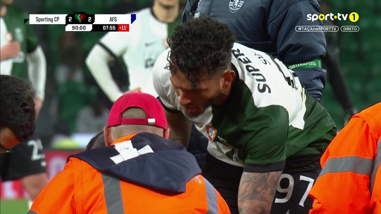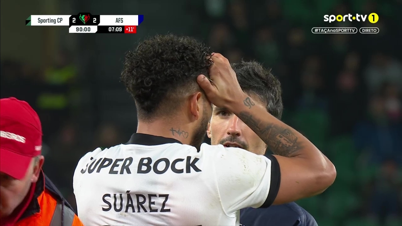 Minuto 90+6: Sporting ganha um livre perigoso após disputa de bola entre Luis Suárez e Baroan, que fica muito queixoso. Jogadores ficam em choque com o estado da perna do jogador do Aves SAD, que parece partida. Luís Suárez levou as mãos à cabeça e Maxi Araújo rezou. Veja, abaixo: