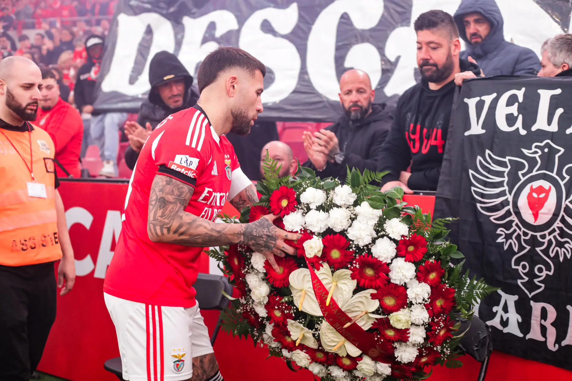Antes do apito inicial no Benfica-Sporting, dérbi que abre a 13.ª jornada da I Liga, os jogadores titulares das águias, liderados pelo capitão Nicolás Otamendi, prestaram homenagem a Sérgio Caetano, antigo líder dos Diabos Vermelhos, que faleceu em novembro, tendo sido encontrado morto nas imediações do Estádio da Luz. Otamendi entregou uma coroa de flores a esse grupo de adeptos. Veja as imagens