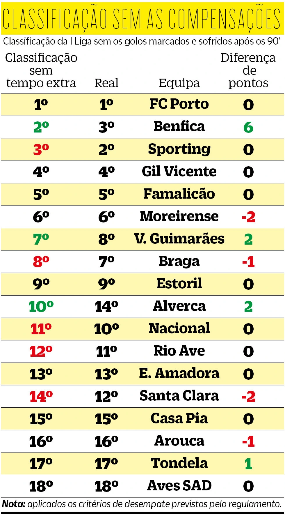 Numa classificação em que os golos marcados após os 90 minutos não contassem, as águias estariam no topo, com os mesmos 31 pontos do FC Porto