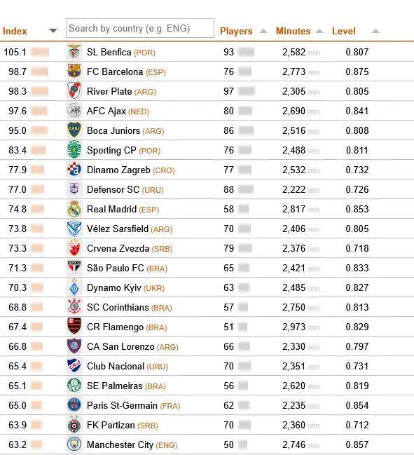 São considerados os jogadores inscritos até 1 de outubro e que atuam em 49 ligas por todo o mundo. O índice analisa o número de jogadores formados em cada clube, o nível do clube onde atuaram no último ano e os minutos de jogo que tiveram. O Benfica teve 93 jogadores formados na sua academia distribuídos pelas mencionadas 49 ligas analisadas, "com um nível médio de clubes empregadores de 0,81 e 2.582 minutos jogados, em média, em jogos oficiais ao longo do último ano".