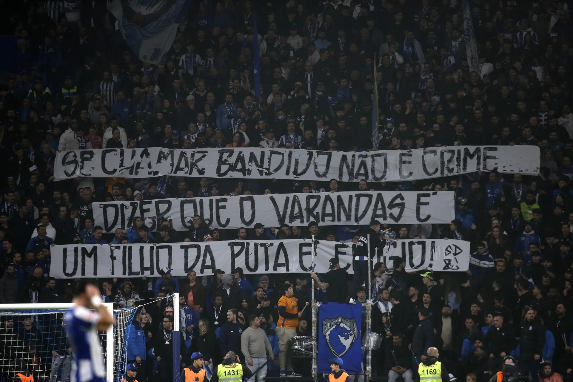 "Se chamar "bandido" não é crime, dizer que o Varandas é um filho da p*** é um elogio", escreveram os Super Dragões, claque afeta ao FC Porto, numa tarja exibida na segunda parte do clássico desta segunda-feira