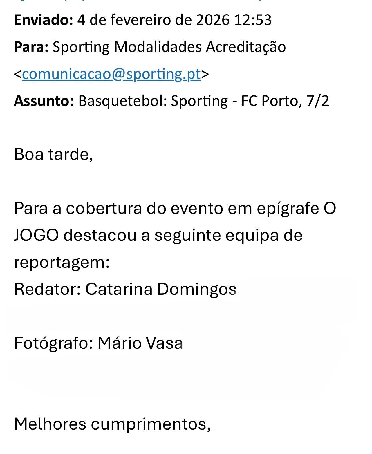 A Direção editorial de O JOGO é informada pela jornalista destacada para o jogo de basquetebol entre Sporting-FC Porto, no pavilhão João Rocha, que o pedido de acreditação - feito a 4 de fevereiro - fora negado pelo clube, que alega corte de relações com o jornal.