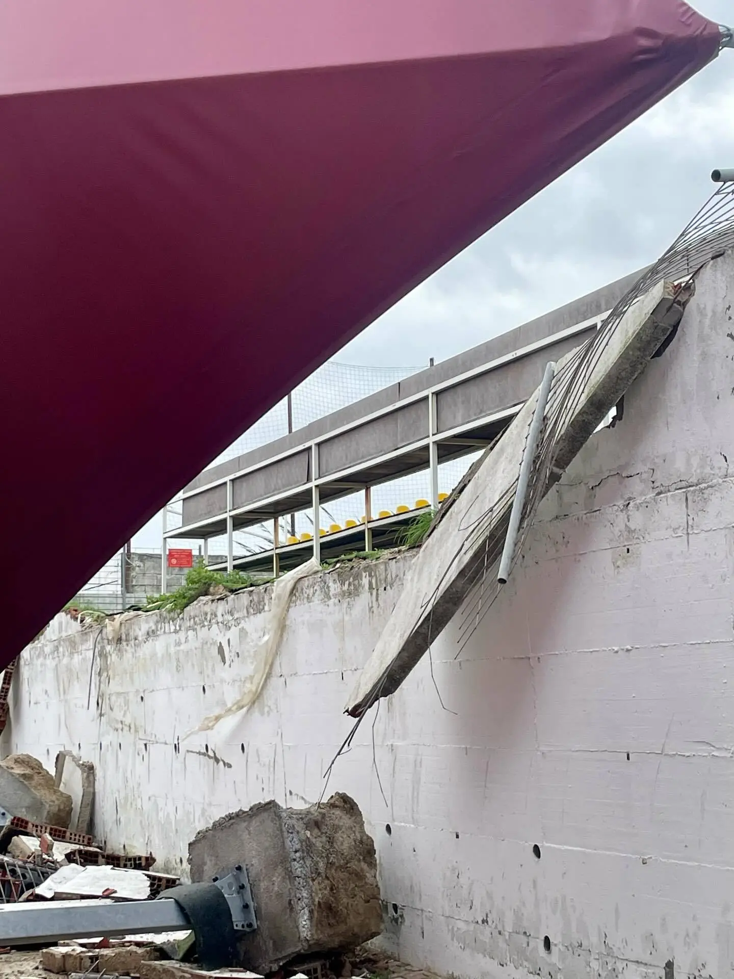 O desabamento dessa estrutura provocou a queda de pedras e parte da parede que sustenta a construção, levando o clube a suspender a atividade desportiva no recinto.