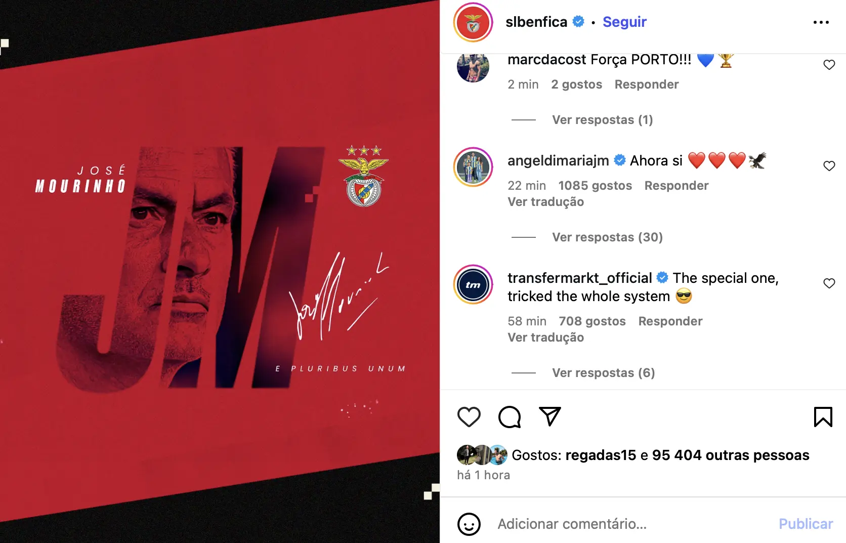Di María, antigo jogador do Benfica, agora ao serviço do Rosario Central, reagiu esta quinta-feira à publicação em que o emblema encarnado anunciou José Mourinho como sucessor de Bruno Lage no comando técnico.