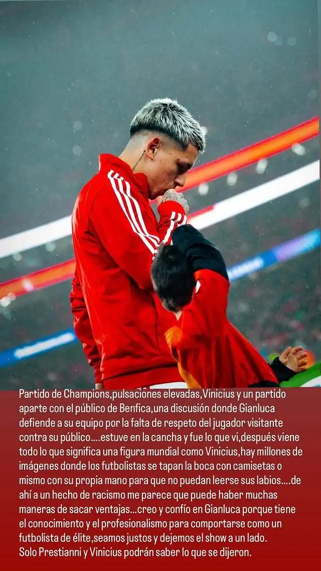 "Jogo da Champions, pulsações elevadas e Vinícius num jogo à parte com o público do Benfica. Houve uma discussão em que Gianluca defende a sua equipa pela falta de respeito do jogador visitante contra o seu público, eu estava no campo e foi isso que vi. Depois vem tudo o que significa uma figura mundial como Vinícius. Há milhões de imagens em que os jogadores cobrem a boca com camisolas ou mesmo com a própria mão para que não se possam ler os seus lábios. Daí a ser um ato de racismo, acho que pode haver muitas maneiras de tirar vantagem. Acredito e confio no Gianluca porque ele tem o conhecimento e o profissionalismo para se comportar como um jogador de futebol de elite. Sejamos justos e deixemos o espetáculo de lado. Só Prestianni e Vinicius saberão o que foi dito", escreveu Gastón Fernández.