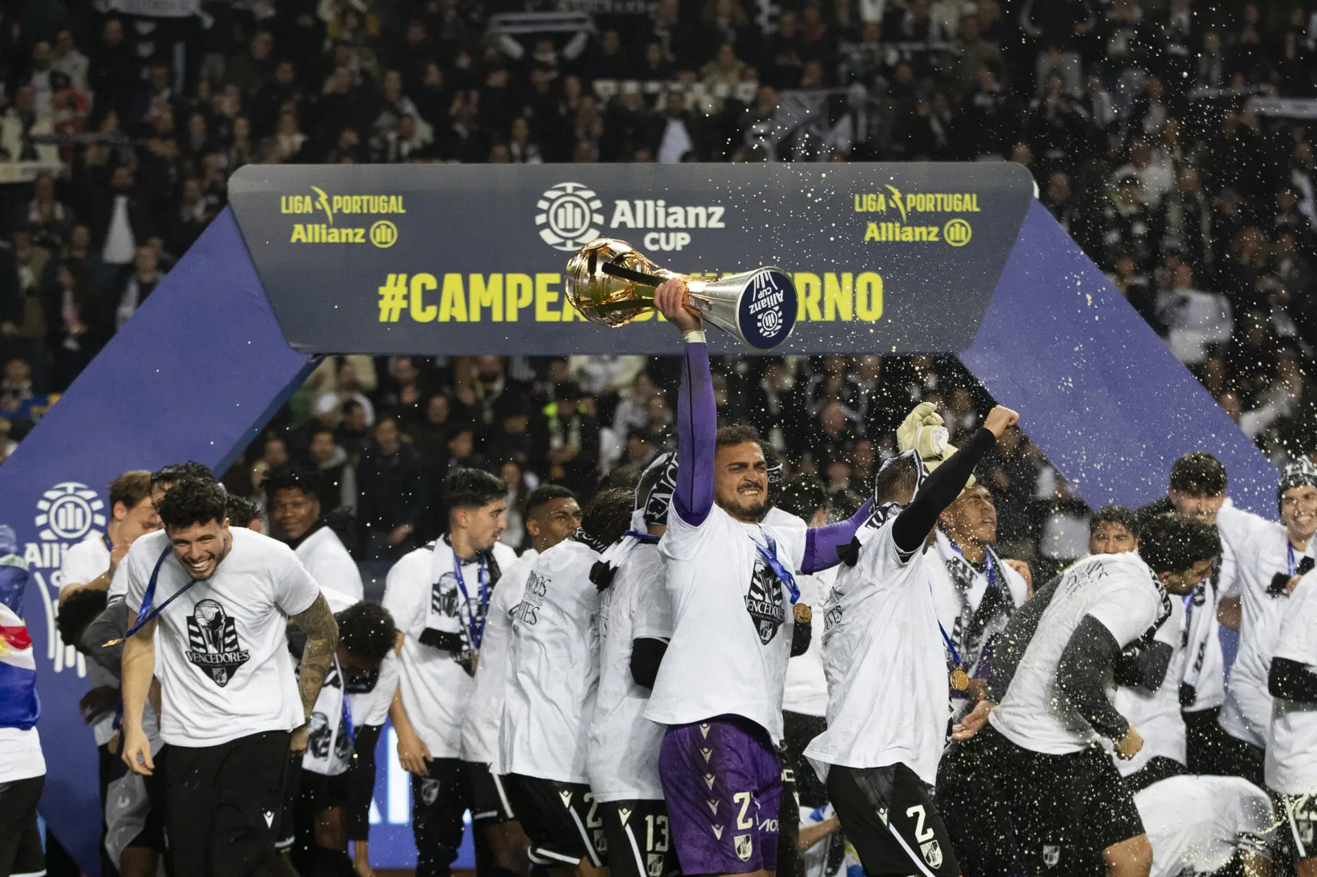 A Taça da Liga chegou como costumam chegar as coisas raras: tarde, pesada de significado, erguida por mãos que tremiam mais de história do que de cansaço. Quando o apito final ecoou em Leiria, já bem depois da hora, não foi apenas um som que se ouviu, foi também a felicidade de uma cidade inteira, guardada há décadas numa respiração contida. As ruas de Guimarães vestiram-se de preto e branco, com as janelas das casas equipadas com cachecóis e bandeiras, à espera dos conquistadores e de um título que fugia há mais de uma década. E nem a chuva, que tornou o festejo mais abençoado, estragou os planos. "Fico muito feliz por ver estes adeptos assim. Não contava ganhar um troféu esta temporada, mas quando ganhámos ao Porto, disse que íamos à final. Quando calhou o Braga, disse que íamos ganhar", partilhou com O JOGO José Cardoso, vestido a rigor.