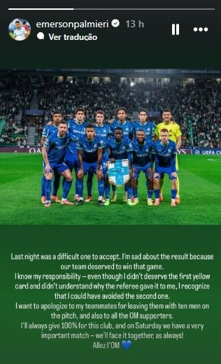 Expulso depois de ter visto dois cartões amarelos num espaço de três minutos na derrota do Marselha contra o Sporting (2-1), em Alvalade, na terceira jornada da fase regular da Liga dos Campeões, Emerson Palmieri recorreu na quinta-feira às redes sociais para pedir desculpa à restante equipa e adeptos do clube francês.