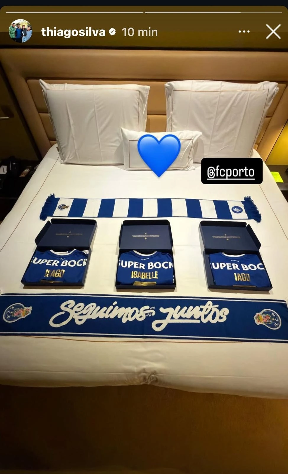 Thiago Silva aterrou este domingo no aeroporto Francisco Sá Carneiro., sendo que o reforço do FC Porto não foi acompanhado pela família nesta viagem. Ainda assim, o central brasileiro mostrou nas redes sociais que os dragões enviaram umas lembranças à sua mulher Isabelle Silva e aos filhos Isago e Iago, nomeadamente camisolas com os seus nomes e cachecóis do clube