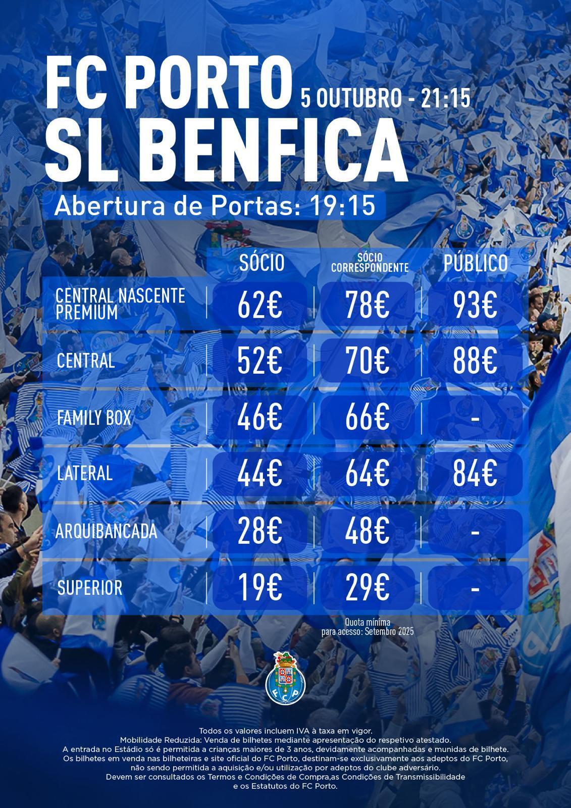 "Os ingressos são exclusivos a sócios em todas as bancadas à exceção da lateral Nascente, da central Nascente e da central Nascente premium - para onde os adeptos do FC Porto também podem adquirir bilhetes. A venda decorre nos locais habituais: bilhetes.fcporto.pt, Loja do Associado e FC Porto Stores (Arrábida Shopping, Baixa, Colombo, Mar Shopping, New Balance Park, Norte Shopping, Parque Nascente e Vila do Conde)", informou o FC Porto, que recordou que de acordo com o regulamento, "é proibida a entrada de adeptos do clube adversário em qualquer setor que não o visitante".