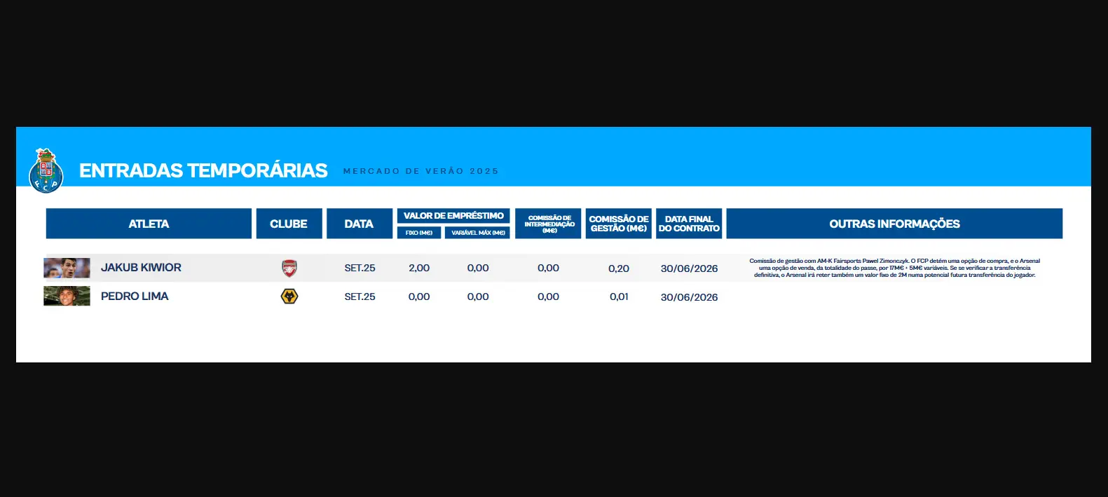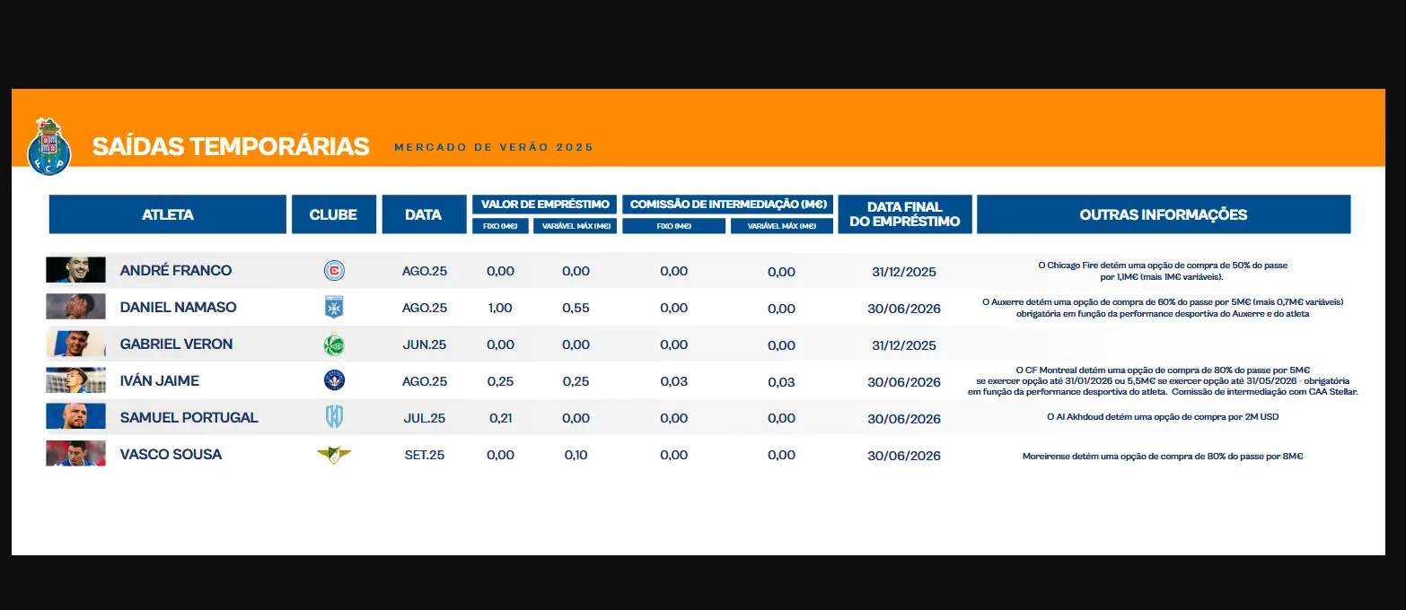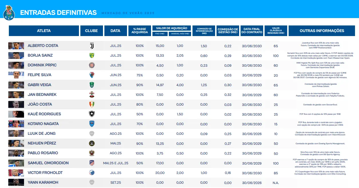 O documento, acessível pelo site dos dragões, detalha todas as entradas e saídas, seja a título definitivo ou empréstimo. Percentagens de passe, valores de aquisição, comissões de intermediação, comissões de gestão, cláusulas de rescisão e outras informações foram divulgadas pela SAD presidida por André Villas-Boas.