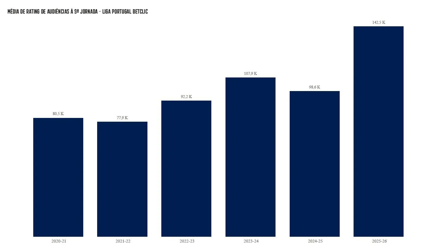 As competições profissionais organizadas pela Liga Portugal continuam a crescer em notoriedade e valorização mediática, um percurso ascendente que se reflete nas audiências televisivas. Segundo dados da GFK, após as primeiras nove jornadas da I Liga, a prova apresenta a melhor média de audiências desde que há registo em períodos homólogos (2020/21), com 142,5 mil telespectadores por jogo. O número supera largamente o anterior máximo, fixado na época 2023/24, com 107,9 mil espectadores por partida.
