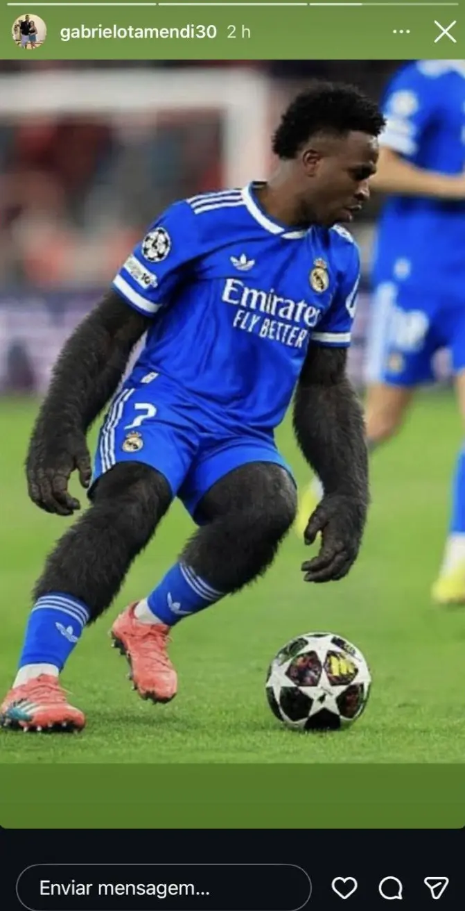 Gabriel Otamendi, irmão de Nicolás Otamendi, defesa-central do Benfica, terá partilhado na rede social Instagram, ainda antes do Real Madrid-Benfica, uma imagem que mostra Vinícius Júnior no corpo de um macaco.