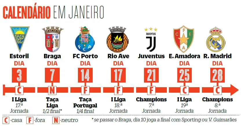 O Estoril, já este sábado, é o adversário que abre as hostilidades para o Benfica em 2026, no encontro que encerra a primeira volta da Liga, mas a partir daí Taça da Liga, Taça de Portugal e Liga dos Campeões vão ter partidas decisivas para os encarnados. A começar logo pela próxima quarta-feira, frente ao Braga, na meia-final da Taça da Liga - caso façam melhor do que na recente visita à Pedreira, os pupilos do Special One têm final marcada ante Sporting ou V. Guimarães. Logo depois, há jogo no Dragão, que decidirá quem segue em frente na Taça de Portugal.