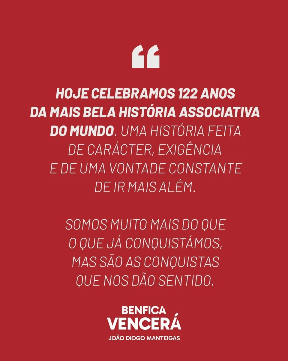 Candidato à presidência das águias nas últimas eleições, João Diogo Manteigas utilizou as redes sociais para deixar uma mensagem pública de parabéns ao emblema encarnado, que completa este sábado 122 anos