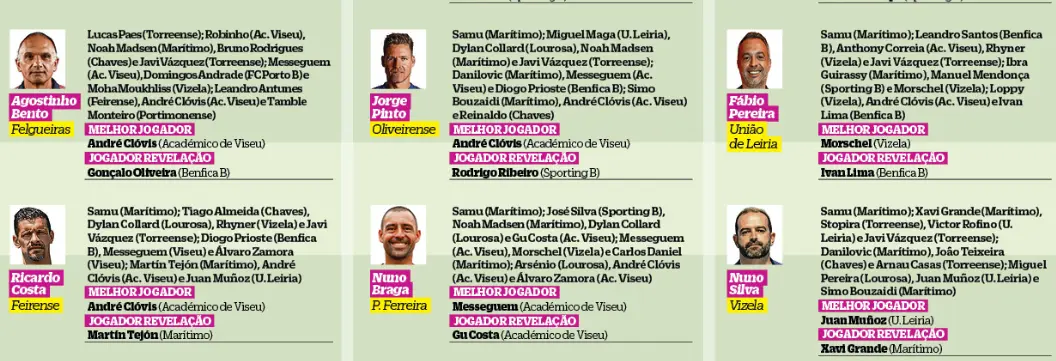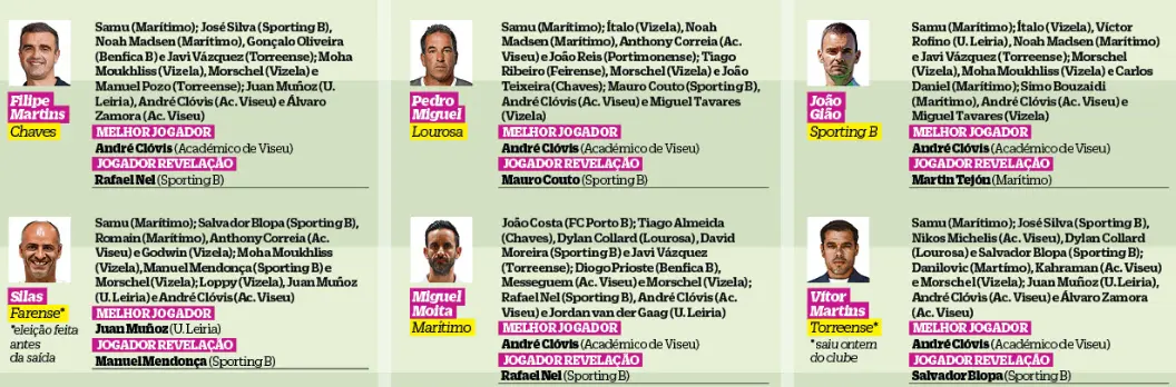 Silas deixou o comando do Farense depois de ter participado nesta eleição. O JOGO convidou Pedro Neto, que o substituiu, para também contribuir, se assim o desejasse. Todavia, a decisão do Farense, e do atual técnico, foi manter as escolhas que tinham sido feitas por Silas. Entretanto, ontem. Vítor Martins deixou o Torreense e foi substituído por Luís Tralhão, que sobe dos sub-23.