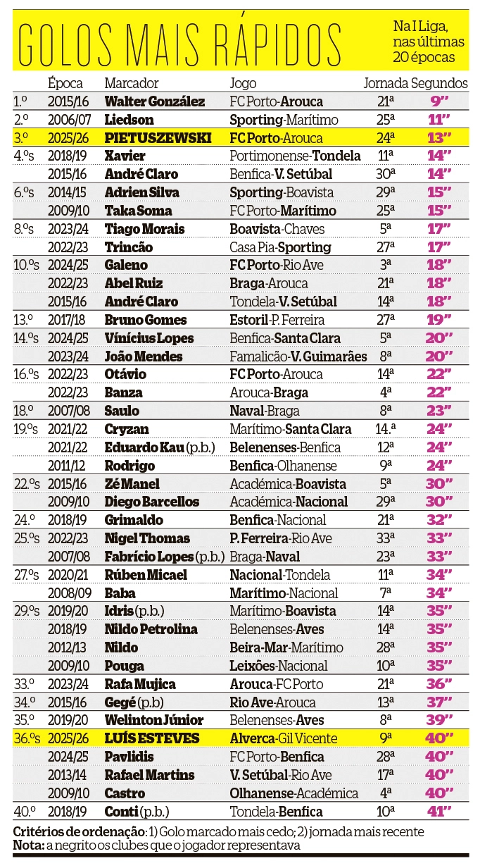 O golo do portista Pietuszewski, aos 13 segundos de jogo, entrou para o terceiro lugar do ranking dos tentos mais rápidos da I Liga nas últimas 20 épocas. A tabela é encimada por Walter González, que pelo Arouca, em 2015/16, marcou ao FC Porto aos nove segundos! Os dragões não conseguiram dar a volta ao resultado e viriam a perder esse jogo por 1-2. Desde 2006/07, contam-se apenas 59 golos - não cabem todos na tabela em baixo - obtidos até aos 59 segundos. Curiosamente, quatro deles foram autogolos.
