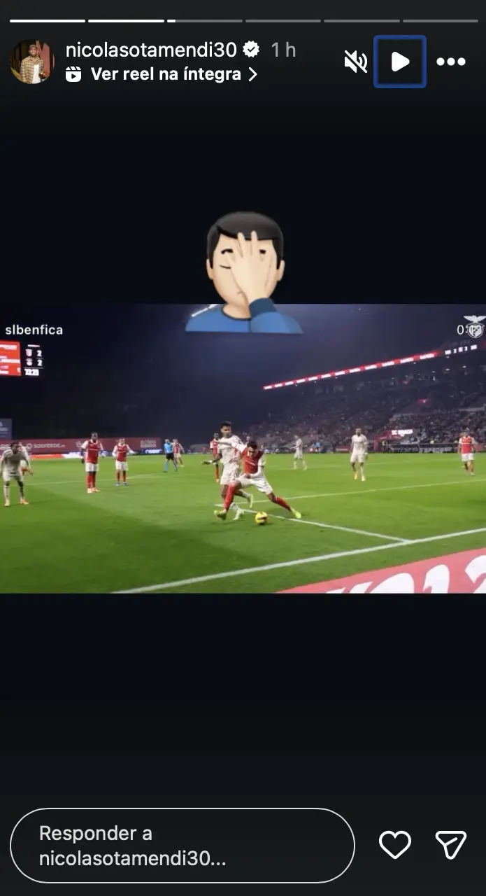 Otamendi, capitão do Benfica, recorreu às redes sociais este domingo para partilhar o vídeo do golo anulado aos encarnados, por falta de Richard Ríos, que daria o 3-2 frente ao Braga.