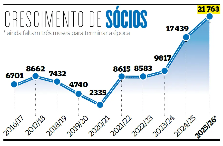 O Portal do Sócio, que o FC Porto lançou no final de fevereiro do ano passado, tem-se revelado uma aposta de sucesso da administração liderada por André Villas-Boas. A plataforma, totalmente digital, simplificou o processo de inscrição de sócio e faz parte da estratégia de transformação do dos dragões, que pretendem ter o associado no centro do clube. Foi um dos desígnios do atual presidente azul e branco e os números, a que O JOGO teve acesso, confirmam que o primeiro ano de vida do portal dificilmente podia ter sido melhor, tendo contribuído para o aumento substancial do associativismo. A caminhar a passos largos para os 180 mil sócios, o FC Porto teve 21 763 novas inscrições esta época, que ainda não terminou, tornando-a já a melhor de sempre. Aliás, como se pode ver na infografia a subida tem sido constante nos últimos anos.