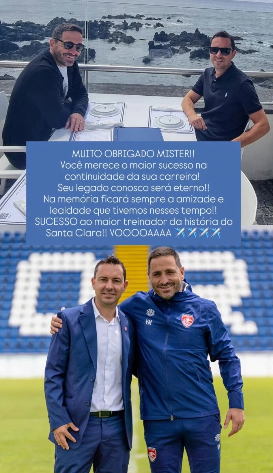 "Muito obrigado, míster! Você merece o maior sucesso na continuidade da sua carreira! O seu legado connosco será eterno! Na memória ficará sempre a amizade e a lealdade que tivemos neste tempo! Sucesso ao maior treinador da história do Santa Clara! Voa!", escreveu.