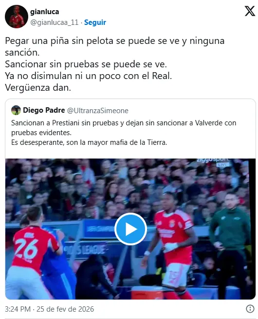 "Dar um murro sem bola pode-se, vê-se e sanção nenhuma. Castigar sem provas pode-se, vê-se. Já nem disfarçam um bocadinho com o Real. Dão vergonha", publicou no X, numa mensagem, entretanto, apagada.