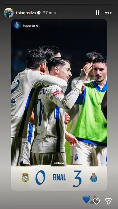 Thiago Silva, reforço do FC Porto anunciado no passado sábado, com contrato até final da época, mais uma de opção, reagiu nas redes sociais ao triunfo em Alverca. O experiente central de 41 anos, ex-Fluminense, publicou uma imagem dos jogadores portistas a festejar, com Borja Sainz em grande plano.
