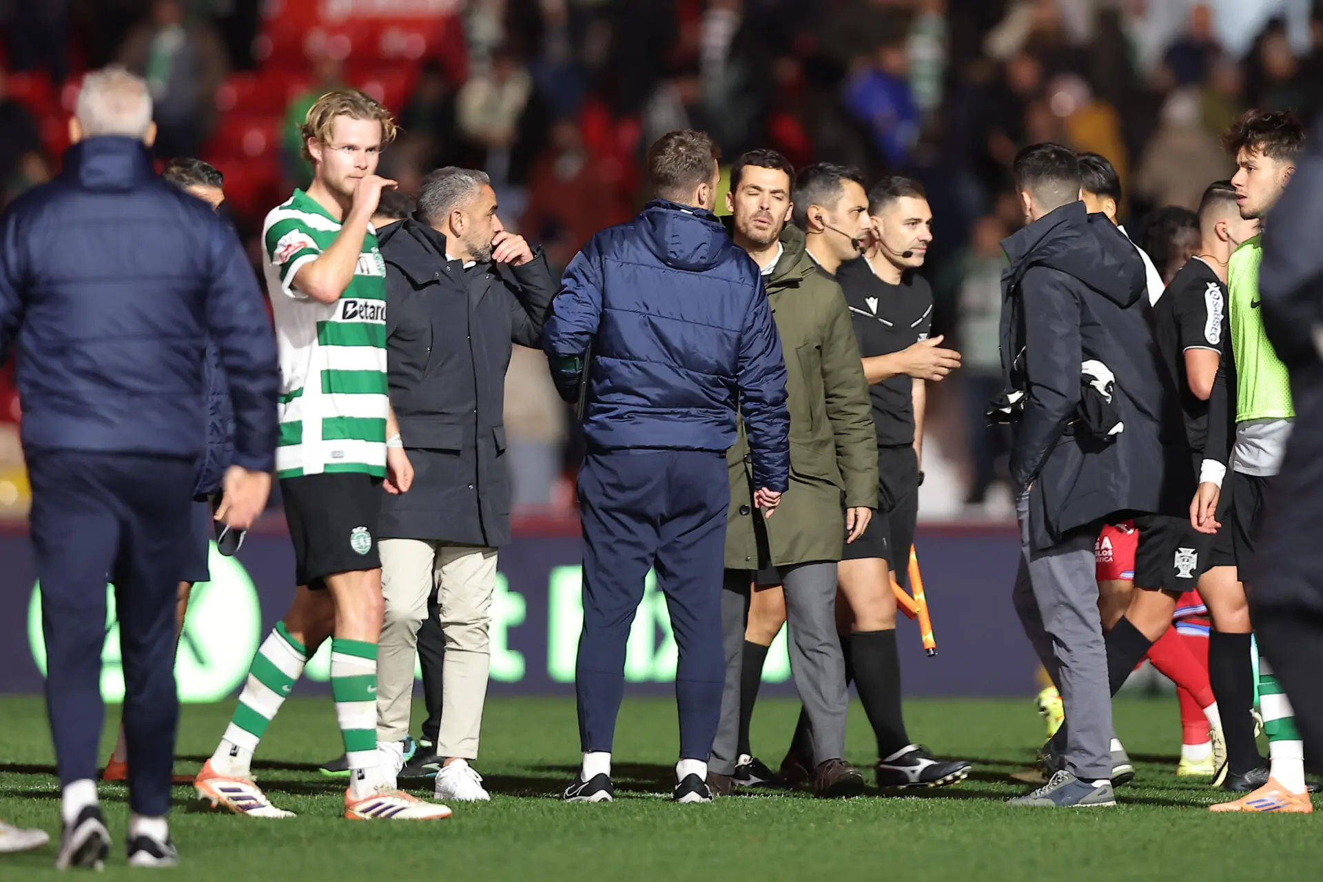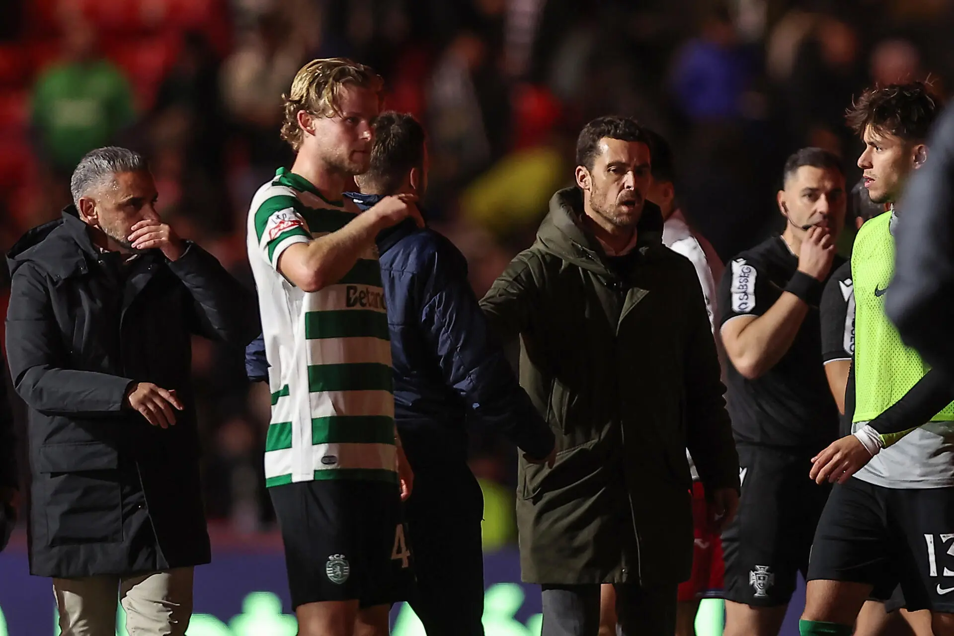 Treinador do Sporting e o capitão Hjulmand dirigiram-se à equipa de arbitragem liderada por Gustavo Correia após o empate com o Gil Vicente, 1-1, em Barcelos, na 17.ª jornada da I Liga, parecendo contestar alguma decisão - recorde-se que Gonçalo Inácio foi expulso perto do final do encontro. Leões podem ver o FC Porto ficar a sete pontos na liderança, caso vença o Santa Clara nos Açores. Veja as imagens: