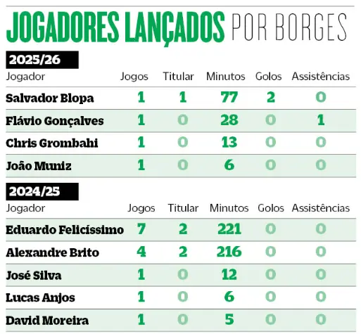 Na Taça da Liga, diante do Alverca, Rui Borges provou, novamente, que não tem medo de apostar nos "diamantes" de Alcochete, e a resposta não poderia ter sido melhor. O estreante Salvador Blopa foi titular e apontou dois dos golos da vitória leonina por 5-1, tendo sido assistido num dos tentos pelo jovem Flávio Gonçalves, também em estreia, aos 70". Nesse encontro, além desta dupla, também João Muniz e Chris Grombahi somaram os primeiros minutos pelo conjunto principal, elevando a nove o número de jogadores formados em Alcochete lançados por Rui Borges desde a sua chegada, na época passada (ver quadro).