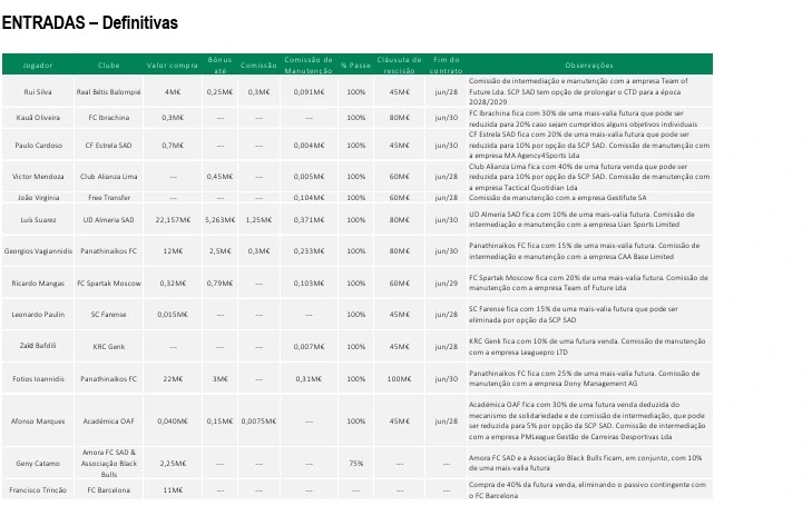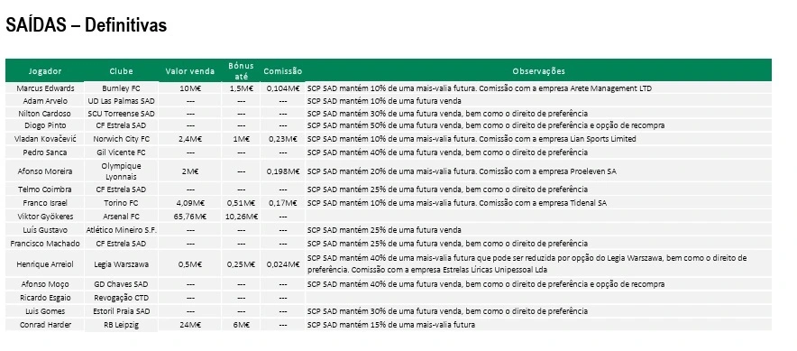 O principal destaque vai para o baixo valor de comissão que o clube pagou nas saídas de Marcus Edwards para o Burnley (104 mil euros), de Vladan Kovacevic para o Norwich (230 mil euros), de Afonso Moreira para o Lyon (198 mil euros), de Franco Israel para o Torino (170 mil euros) e de Henrique Arreiol para o Légia Varsóvia (250 mil euros).