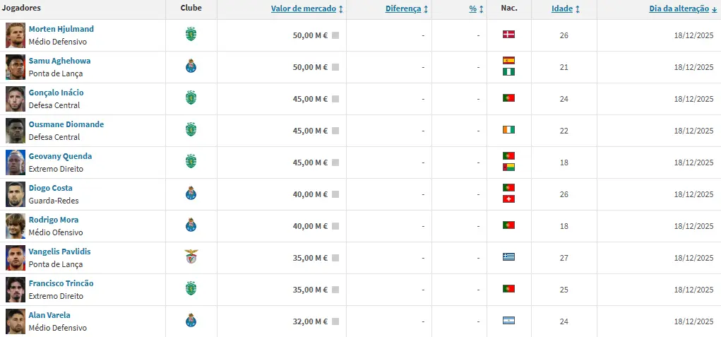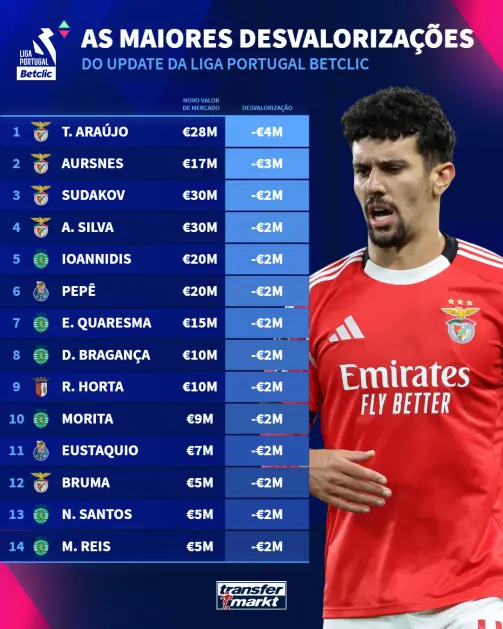 Em sentido oposto, quem se destaca pela negativa é Tomás Araújo. O defesa-central do Benfica vale agora menos quatro milhões de euros (passou dos 32 para os 28). Aursnes, Sudakov e António Silva, também do Benfica, viram igualmente a sua cotação baixar. Ioannidis, Eduardo Quaresma, Hidemasa Morita, Pepê e Eustaquio também registaram "quedas". Ricardo Horta, apesar do bom momento, passou dos 12 para os 10 milhões de euros, devido ao "fator idade", explica o Transfermarkt.