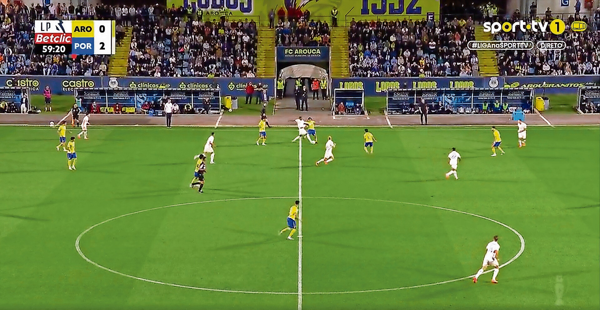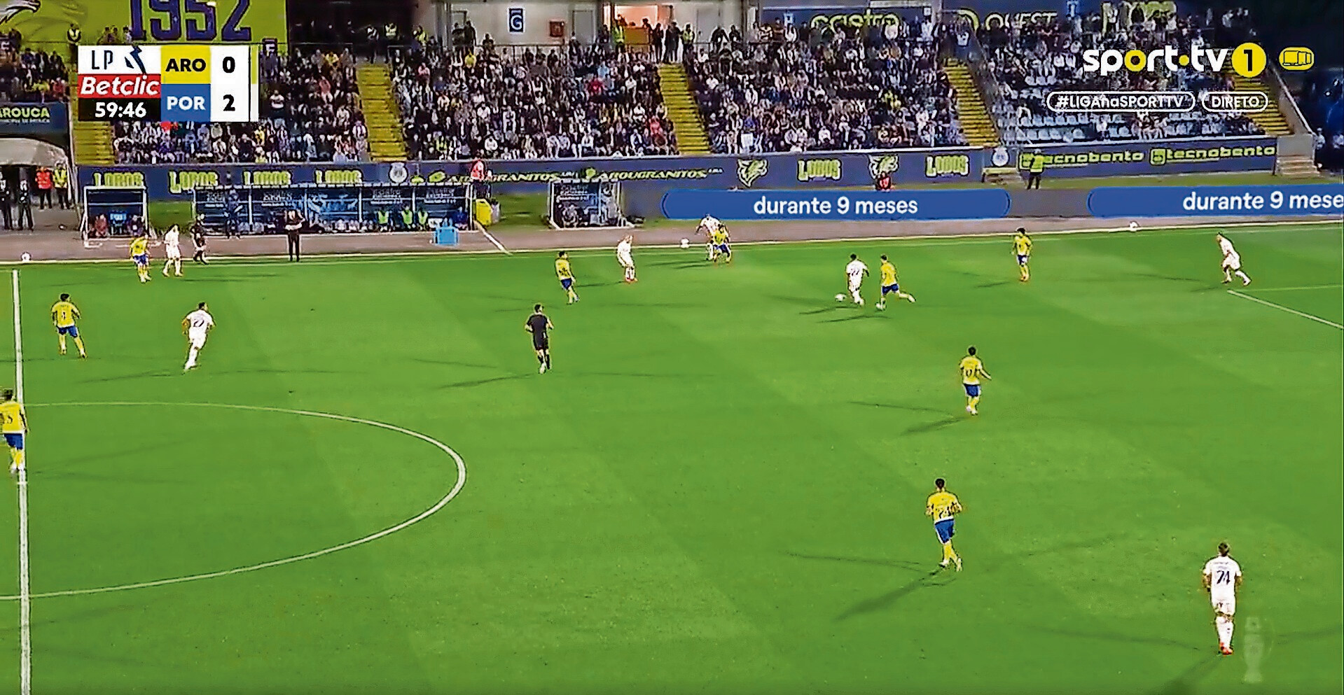 A jogada do terceiro golo do FC Porto em Arouca, finalizado por Francisco Moura, impressionou pelo número de jogadores envolvidos, a sucessão de passes e a mudança de velocidade até, como que de repente, o Arouca ficou desequilibrado. Mais relevante ainda por ter sido desenhada com os dragões já reduzidos a dez jogadores, pela expulsão de Martim Fernandes, dando corpo a um triunfo que alargou a sequência perfeita desde o início da caminhada. O lance foi isolado lado em seis momentos e começa num lançamento lateral de Pablo Rosario para Victor Froholdt, aos 59:11. O dominicano mantém viva uma posse de bola que colecionou 17 passes e ainda foi a Kiwior, Diogo Costa, Bednarek, Alan Varela e Pepê, antes de Borja Sainz assistir Moura, aos 59:58. Várias dessas trocas foram a um ou dois toques, até Froholdt soltar-se em passada larga e chegar ao último terço.