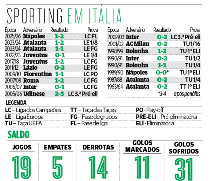 O Sporting, embalado por duas vitórias em três jogos na Liga dos Campeões (ocupa o 11.º lugar na Fase de Liga), a última delas diante do Marselha, há duas semanas, vai ter agora pela frente a Juventus e enfrenta, na terça-feira, em Turim, um dos seus maiores fantasmas nas competições europeias: nunca até hoje ganhou qualquer jogo em Itália.