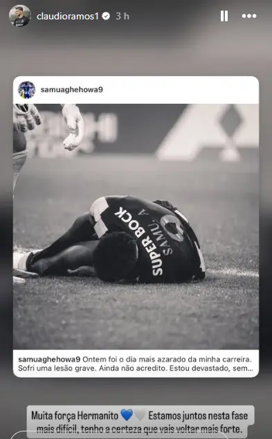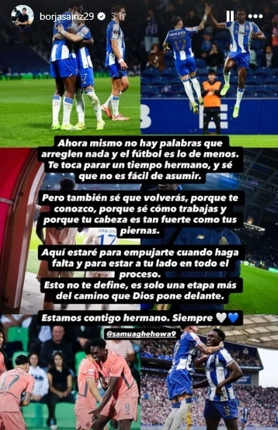 A mensagem de Borja Sainz: "Não há palavras que reparem nada e o futebol é o menos importante. Tocou-te para um tempo e sei que não é fácil de assumir. Também sei que voltarás, porque te conheço, porque sei como trabalhas e porque a tua cabeça é tão forte como as tuas pernas. Aqui estarei para empurrar-te quando fizer falta e para estar ao lado em todo o processo. Isto não te define, é só uma etapa mais do caminho que Deus escolheu. Estamos contigo, sempre."