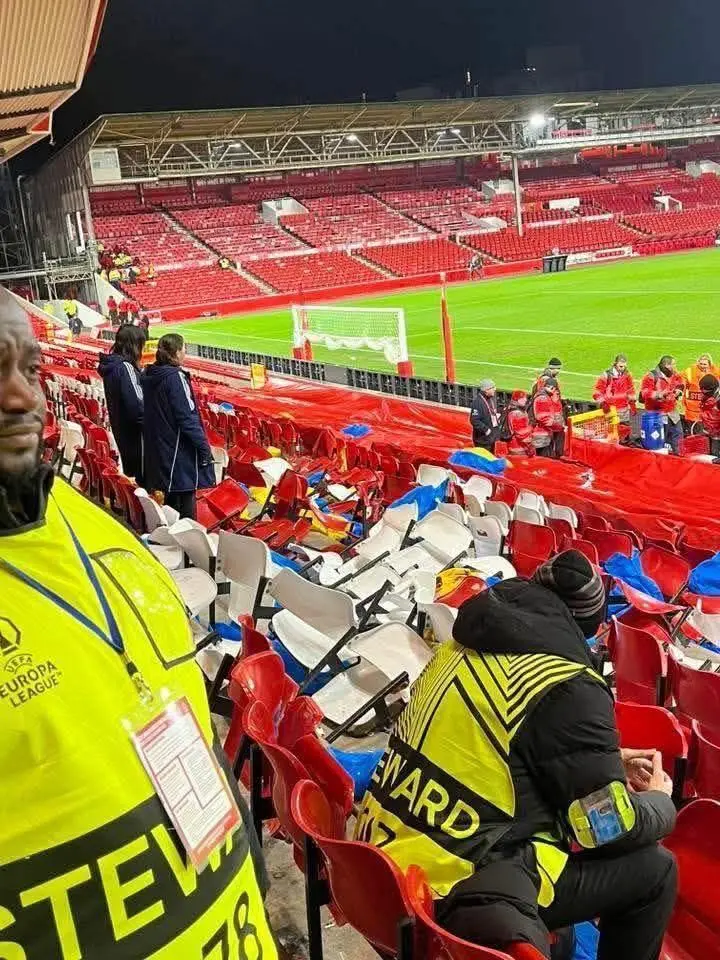 Várias cadeiras ficaram destruídas no setor em que os adeptos do Fenerbahçe assistiram ao jogo de quinta-feira no estádio do Nottingham Forest. O Fenerbahçe venceu a partida por 1-2, mas foi eliminado da Liga Europa, pois tinha perdido na primeira mão, por 0-3.