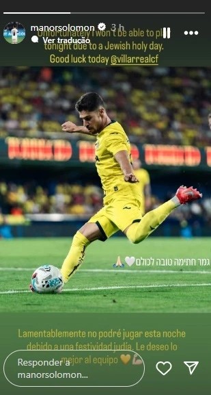 "Lamentavelmente, não poderei jogar esta noite devido a uma festividade judaica. Desejo o melhor à equipa", escreveu Solomon, que se junta aos lesionados Gerard Moreno, Ayoze Pérez, Logan Costa, Willy Kambwala e Juan Foyth nas baixas do "Submarino Amarelo". Por outro lado, espera-se que o defesa internacional português Renato Veiga seja titular frente aos italianos.