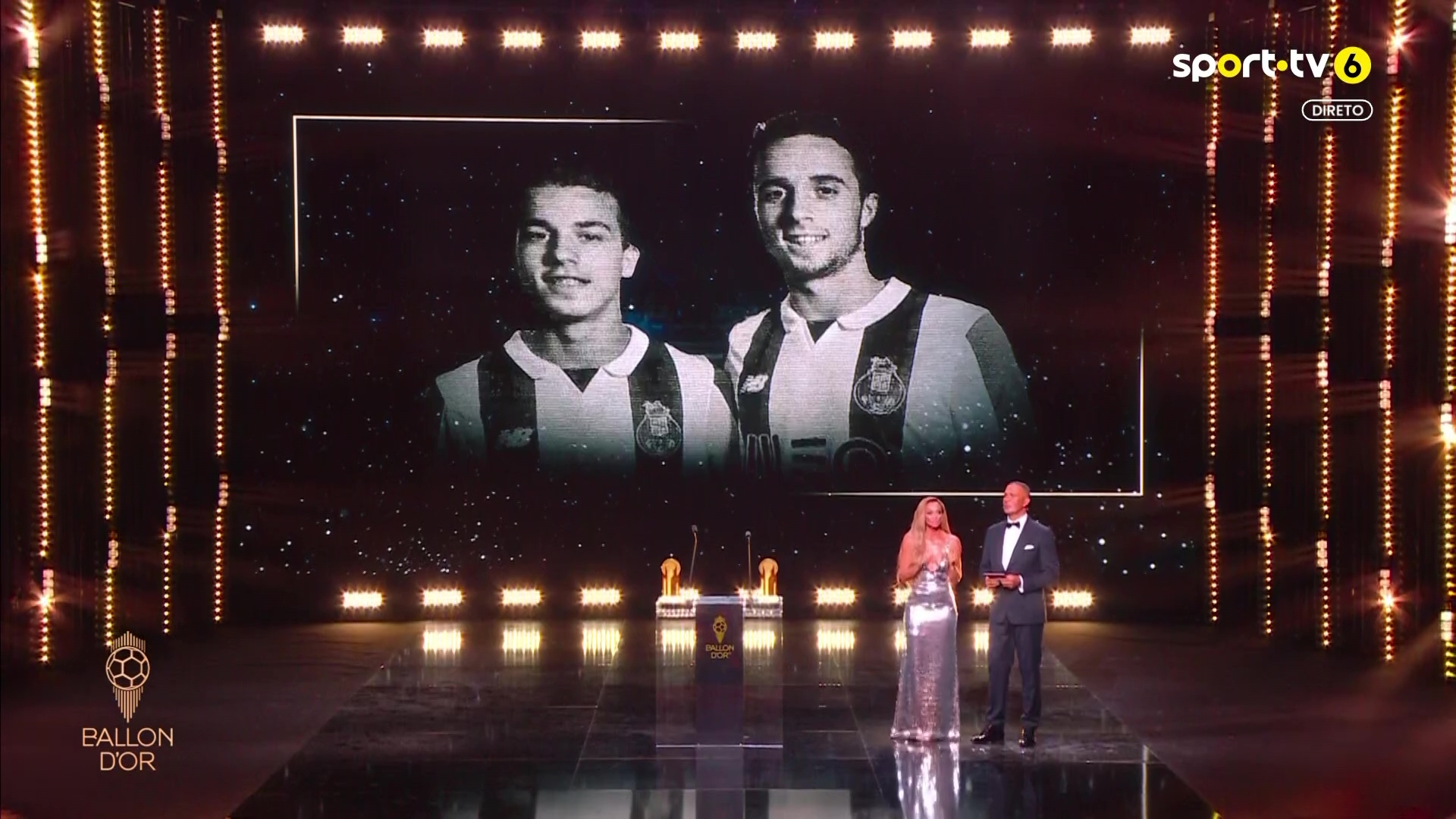 Momento solene na gala da Bola de Ouro com vídeo de homenagem a Diogo Jota e André Silva, que faleceram em acidente de automóvel. Rute Cardoso, esposa de Diogo Jota, está presente na cerimónia.