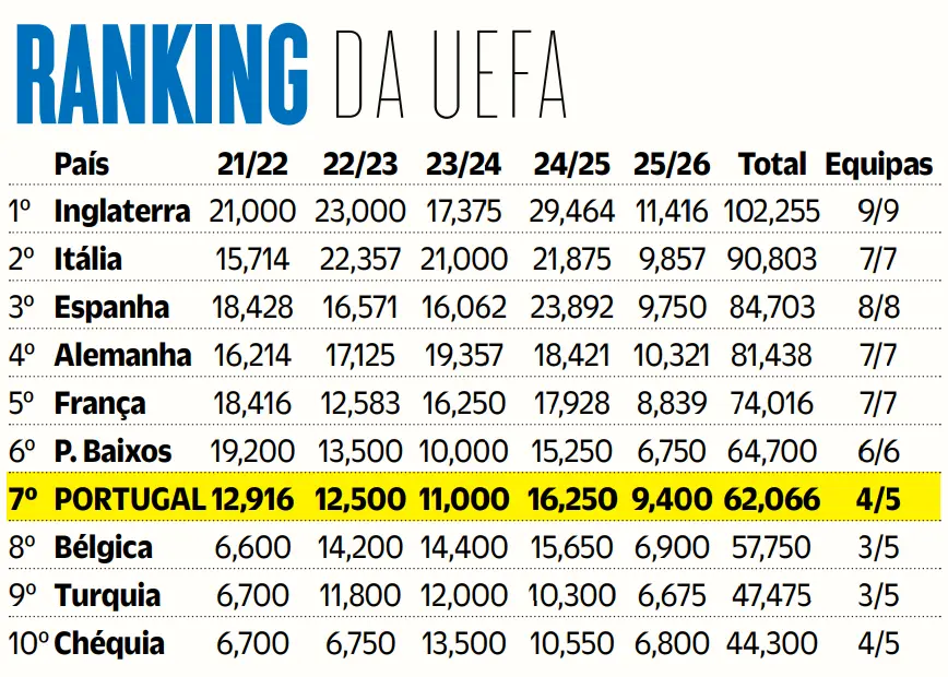 Concluído mais um dia de Liga dos Campeões, assim está Portugal no ranking da UEFA